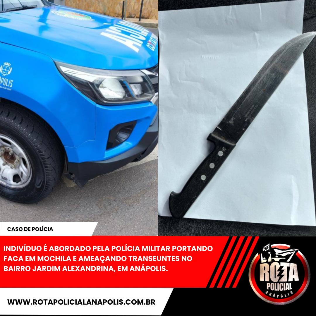 Um indivíduo de 37 anos foi abordado pela Polícia Militar após denúncia de que ele estaria ameaçando transeuntes com uma faca na manhã desta quarta-feira (10), na Av. Tiradentes no Bairro Jardim Alexandrina, em Anápolis.