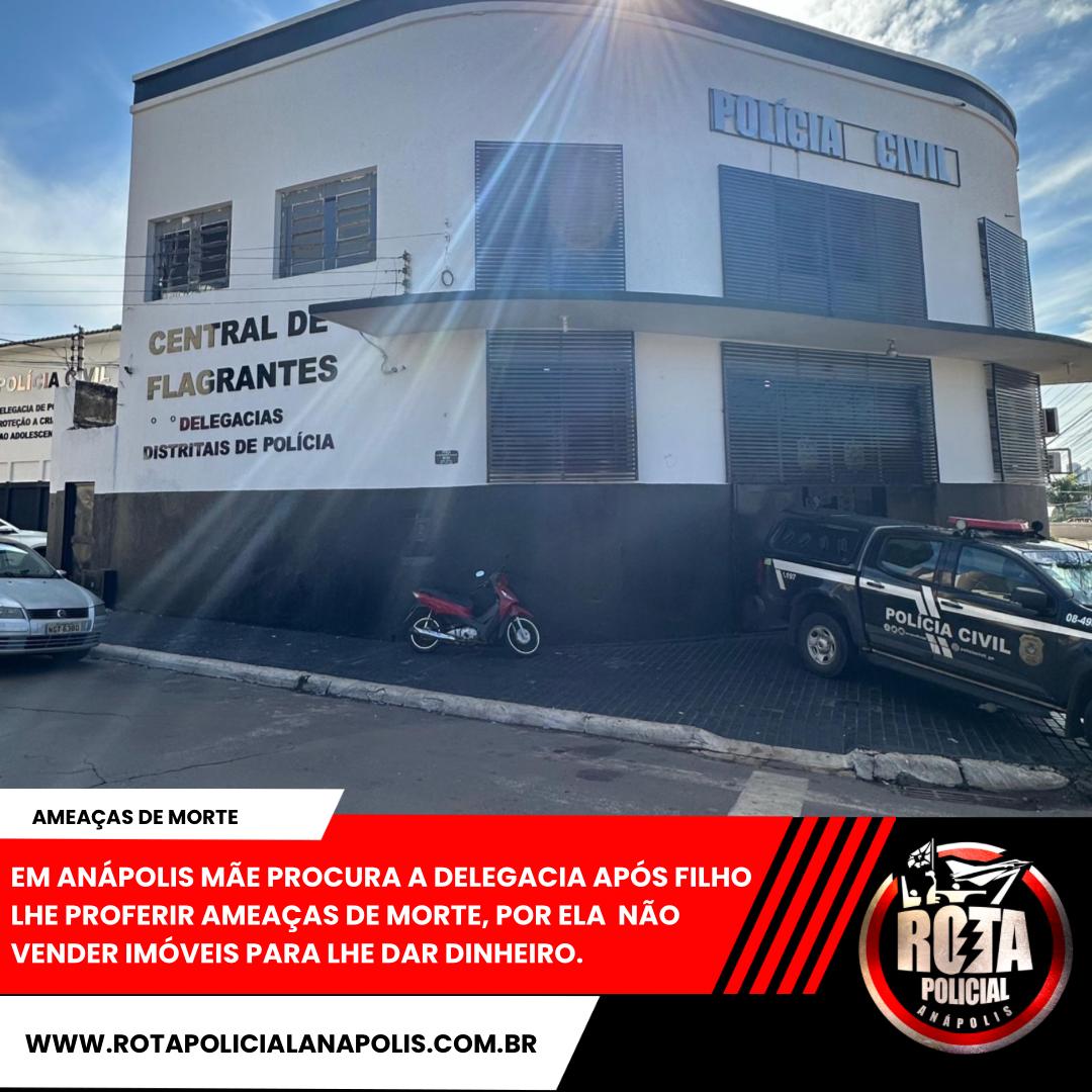 EM ANÁPOLIS MÃE PROCURA A DELEGACIA APÓS FILHO LHE PROFERIR AMEAÇAS DE MORTE, POR ELA NÃO VENDER IMÓVEIS PARA LHE DAR DINHEIRO.
