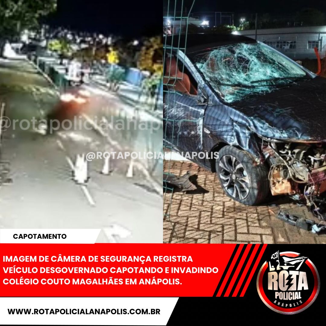 IMAGEM DE CÂMERA DE SEGURANÇA REGISTRA VEÍCULO DESGOVERNADO CAPOTANDO E INVADINDO COLÉGIO COUTO MAGALHÃES EM ANÁPOLIS.