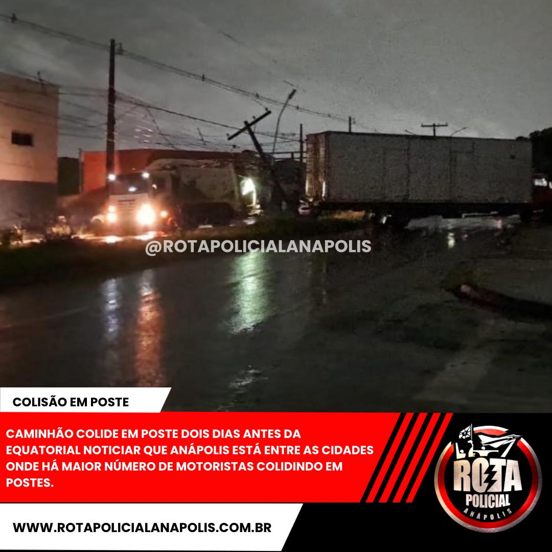 CAMINHÃO COLIDE EM POSTE DOIS DIAS ANTES DA EQUATORIAL NOTICIAR QUE ANÁPOLIS ESTÁ ENTRE AS CIDADES ONDE HÁ MAIOR NÚMERO DE MOTORISTAS COLIDINDO EM POSTES.