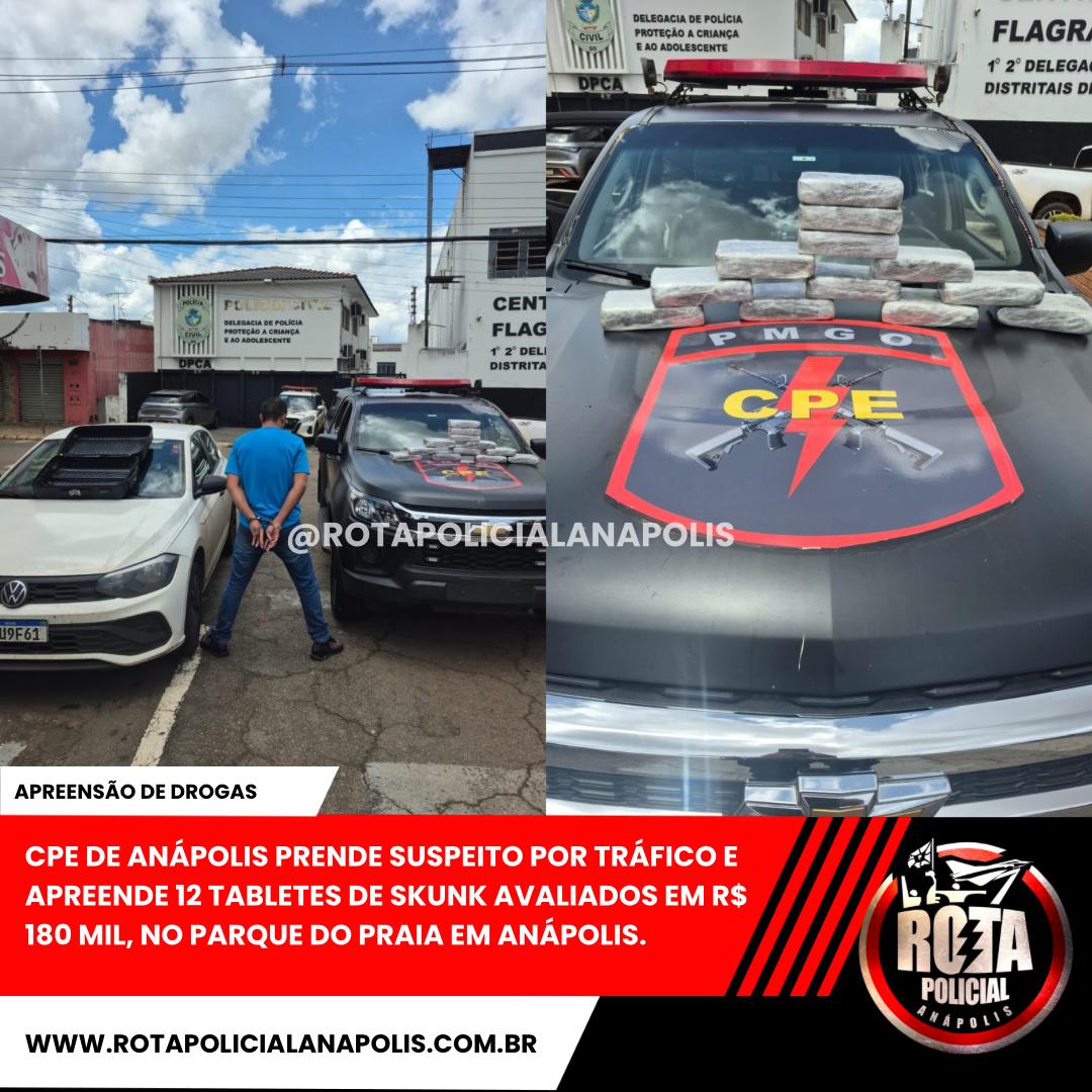 CPE DE ANÁPOLIS PRENDE SUSPEITO POR TRÁFICO E APREENDE 12 TABLETES DE SKUNK AVALIADOS EM R$ 180 MIL, NO PARQUE DO PRAIA EM ANÁPOLIS.