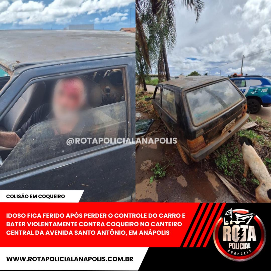 IDOSO FICA FERIDO APÓS PERDER O CONTROLE DO CARRO E BATER VIOLENTAMENTE CONTRA COQUEIRO NO CANTEIRO CENTRAL DA AVENIDA SANTO ANTÔNIO, EM ANÁPOLIS