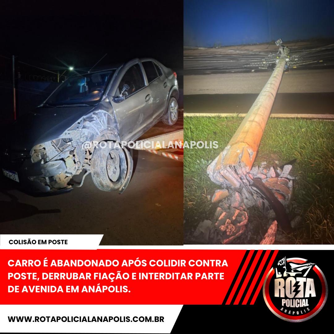 CARRO É ABANDONADO APÓS COLIDIR CONTRA POSTE, DERRUBAR FIAÇÃO E INTERDITAR PARTE DE AVENIDA EM ANÁPOLIS.