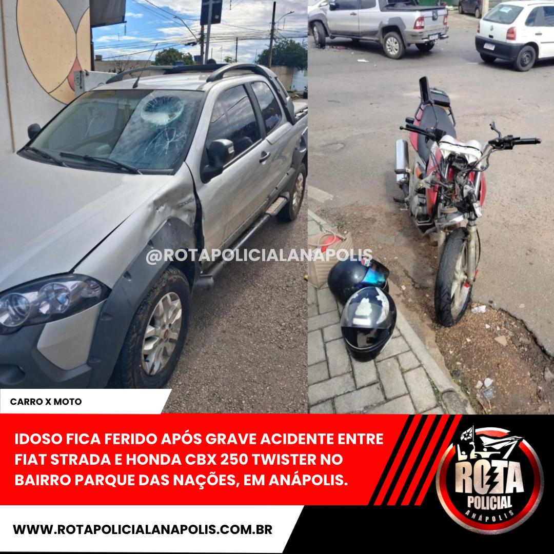 IDOSO FICA FERIDO APÓS GRAVE ACIDENTE ENTRE FIAT STRADA E HONDA CBX 250 TWISTER NO BAIRRO PARQUE DAS NAÇÕES, EM ANÁPOLIS.