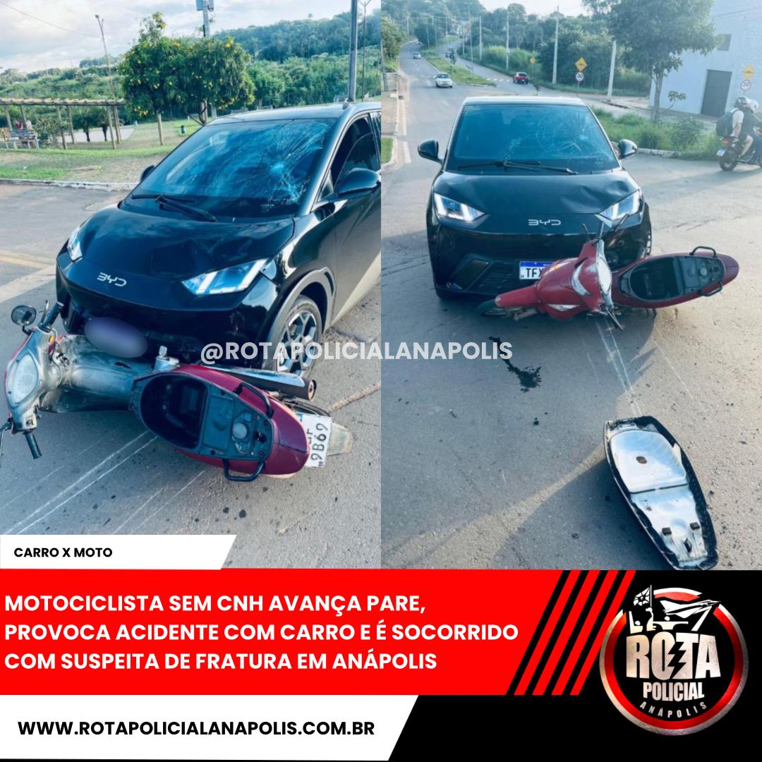 MOTOCICLISTA TEM GRAVE FRATURA NA PERNA APÓS SER ATINGIDO POR VEÍCULO CONDUZIDO POR MULHER EMBRIAGADA E SEM CARTEIRA DE HABILITAÇÃO, EM ANÁPOLIS.