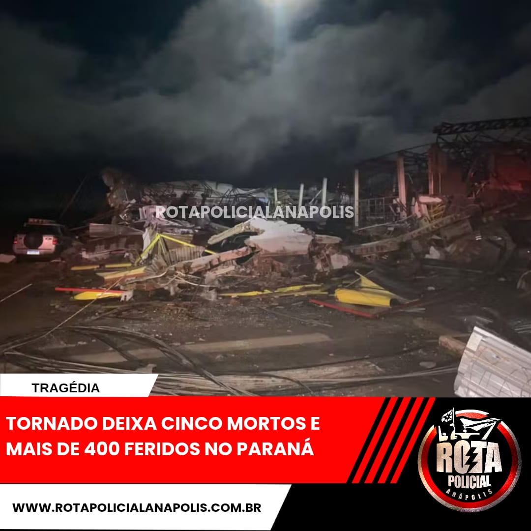 Um tornado devastou o estado do Paraná na tarde desta sexta-feira, 7, e deixou cinco pessoas mortas, sendo quatro em Rio Bonito do Iguaçu e uma em Guarapuava, segundo a Defesa Civil. Além disso, mais de 430 pessoas ficaram feridas. Imagens que circulam nas redes sociais mostram casas destelhadas, imóveis danificados e postes de energia no chão.