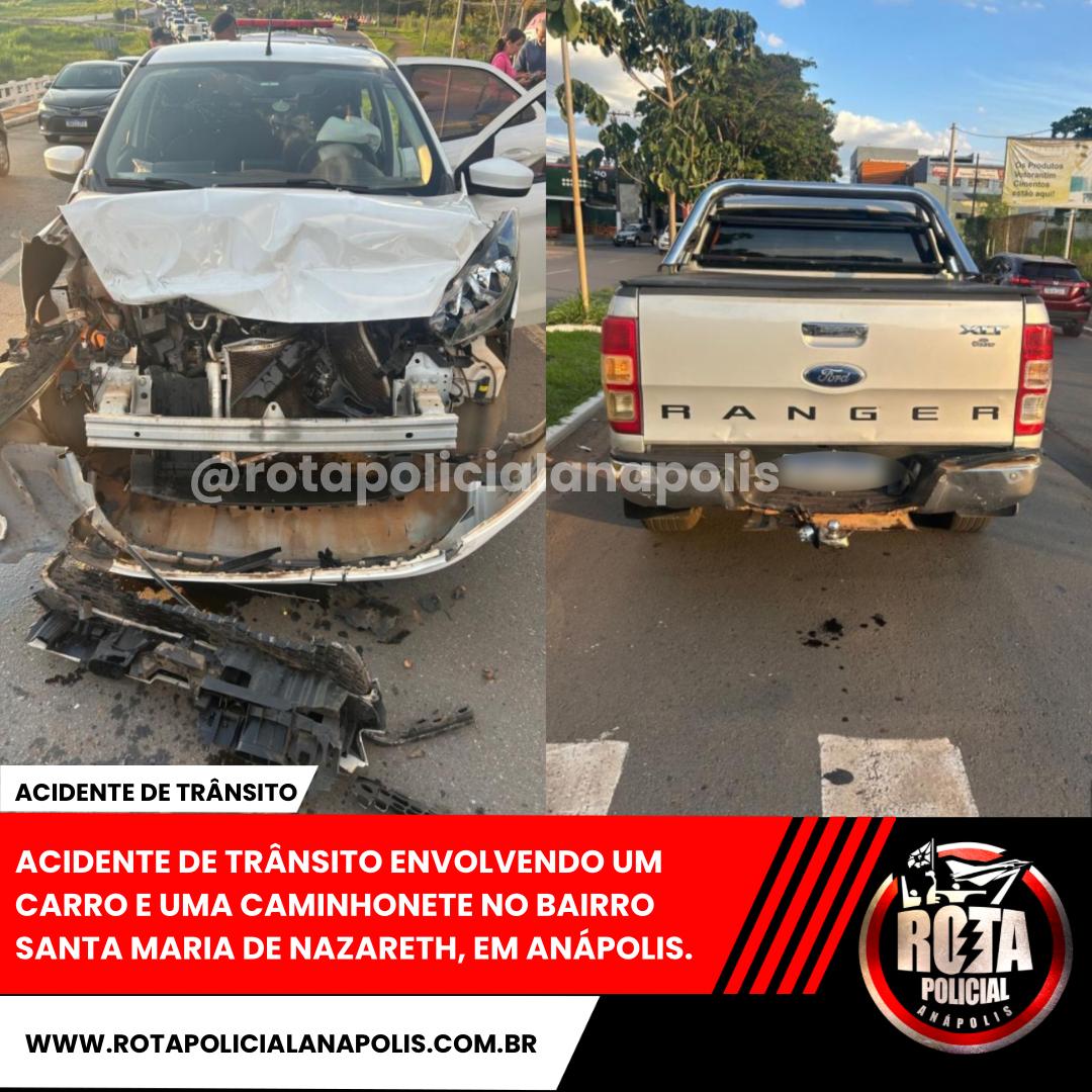 Foi registrado um acidente de trânsito envolvendo um carro e uma caminhonete na tarde desta quinta-feira (27), na Av. Ana Jacinta, no Bairro Vila Santa Maria de Nazareth, em Anápolis.
