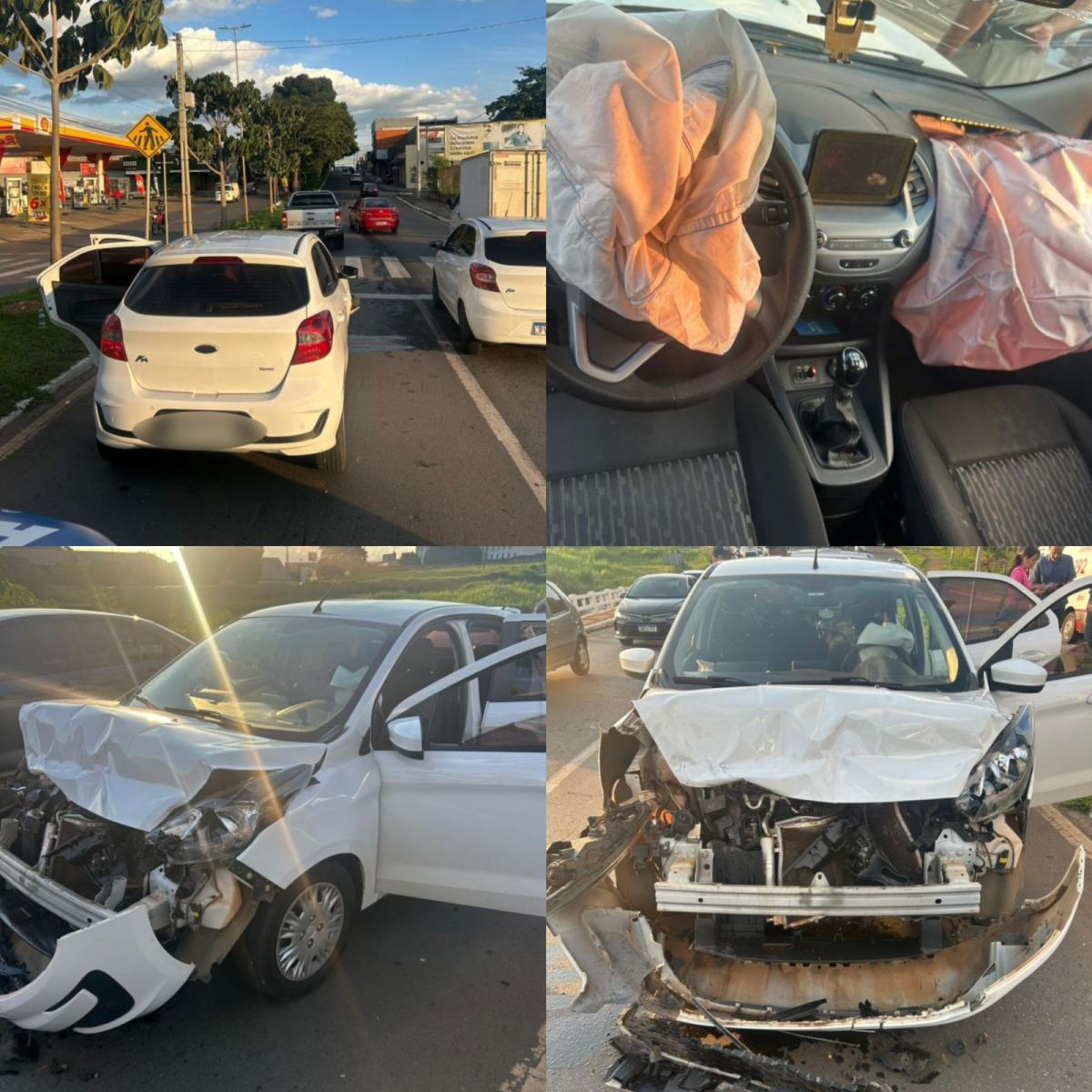 Uma mulher que estava como passageira do veículo Ford Ka sofreu lesão no joelho em decorrência da abertura do airbag. Uma ambulância do SAMU foi acionada para atender à ocorrência e a vítima recebeu os primeiros socorros no local.