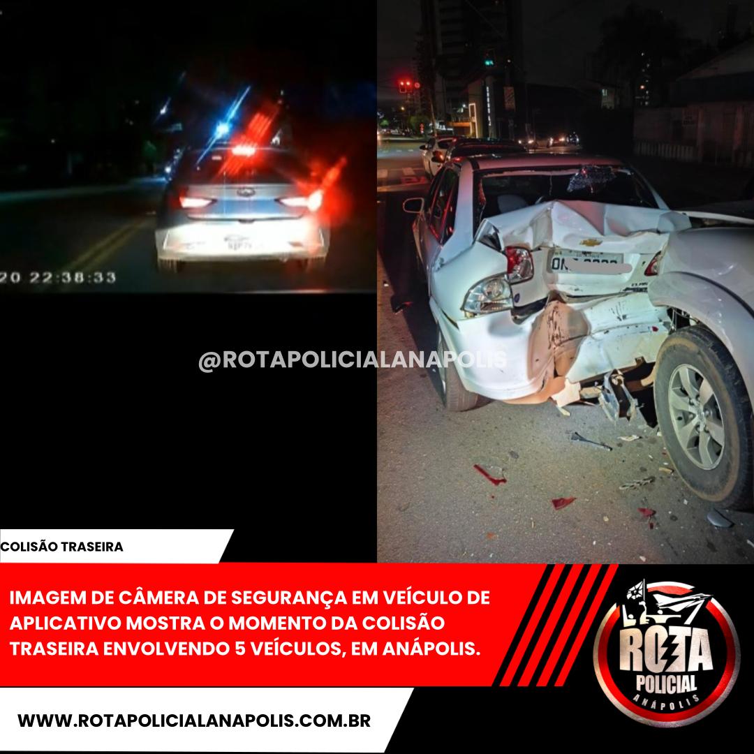 Imagens de câmera de segurança instalada em um veículo de aplicativo registraram um momento em que ocorreu a colisão traseira envolvendo cinco veículos na noite deste sábado (20) na Av. Jamel Cecílio no Bairro Jundiaí, em Anápolis.