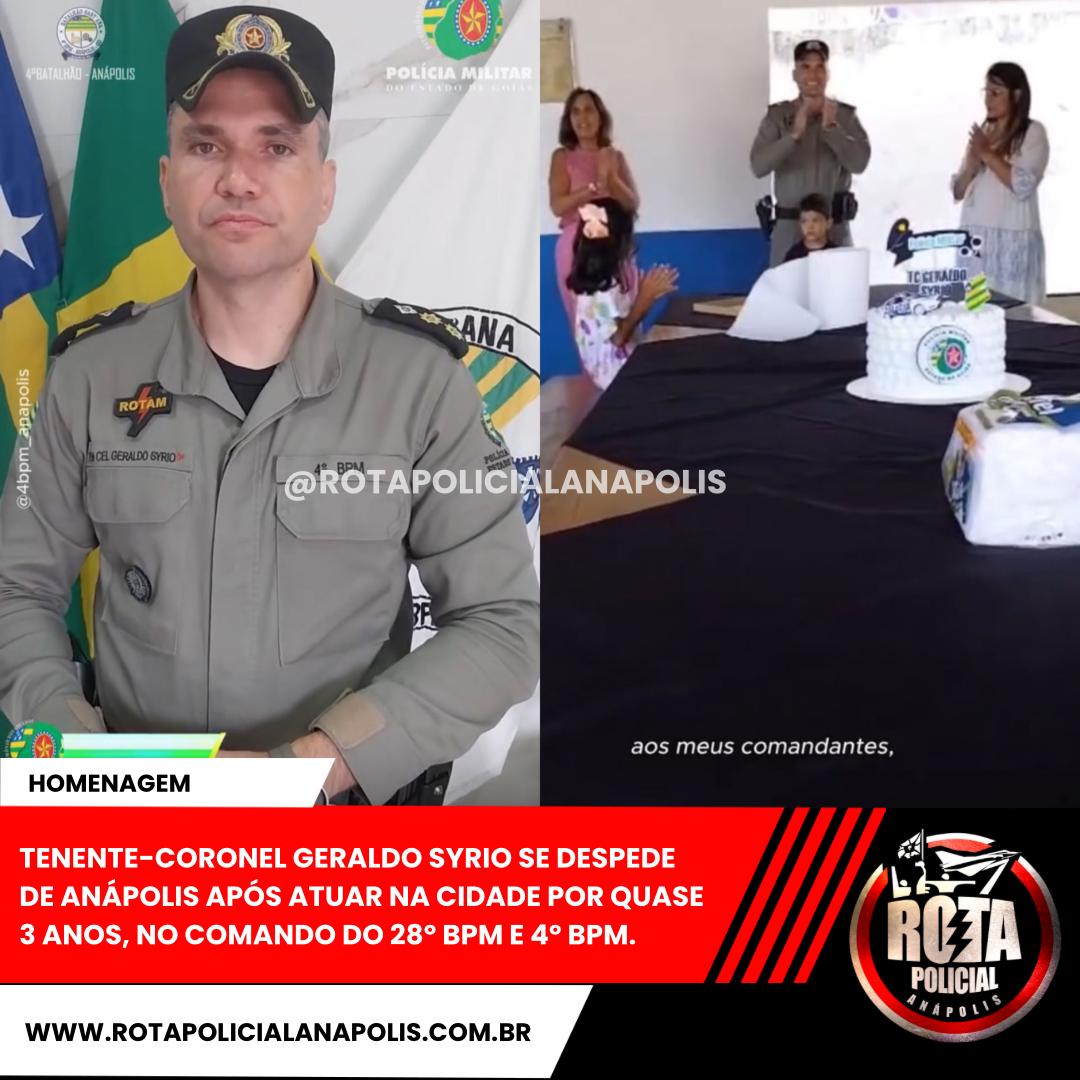 O comandante Tenente-Coronel Geraldo Syrio deixa uma homenagem especial de agradecimento à comunidade de Anápolis e à tropa do 4º BPM e do 28º BPM após quase três anos atuando como comandante na cidade de Anápolis.