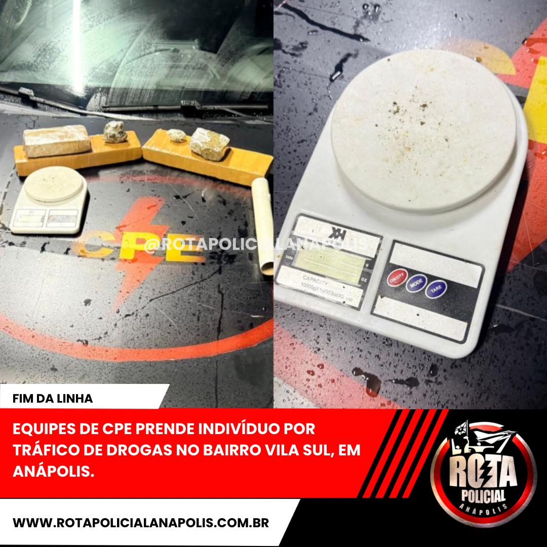 Equipes de CPE, após uma denúncia anônima, prenderam um indivíduo de 30 anos pelo crime de tráfico de drogas em uma residência na noite desta quarta-feira (21), no Bairro Vila Sul, em Anápolis.