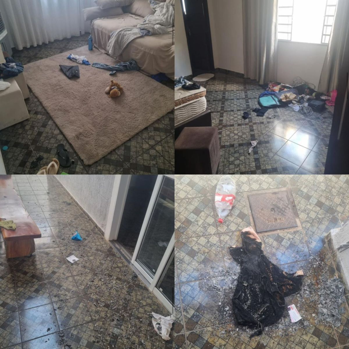 Ao proceder uma vistoria do imóvel, constatou-se uma desordem generalizada, roupas jogadas ao chão, pratos e objetos de vidro quebrados, além de focos de incêndio em um tapete e em outros objetos sólidos, como papéis e papelão, provocados pelo homem.