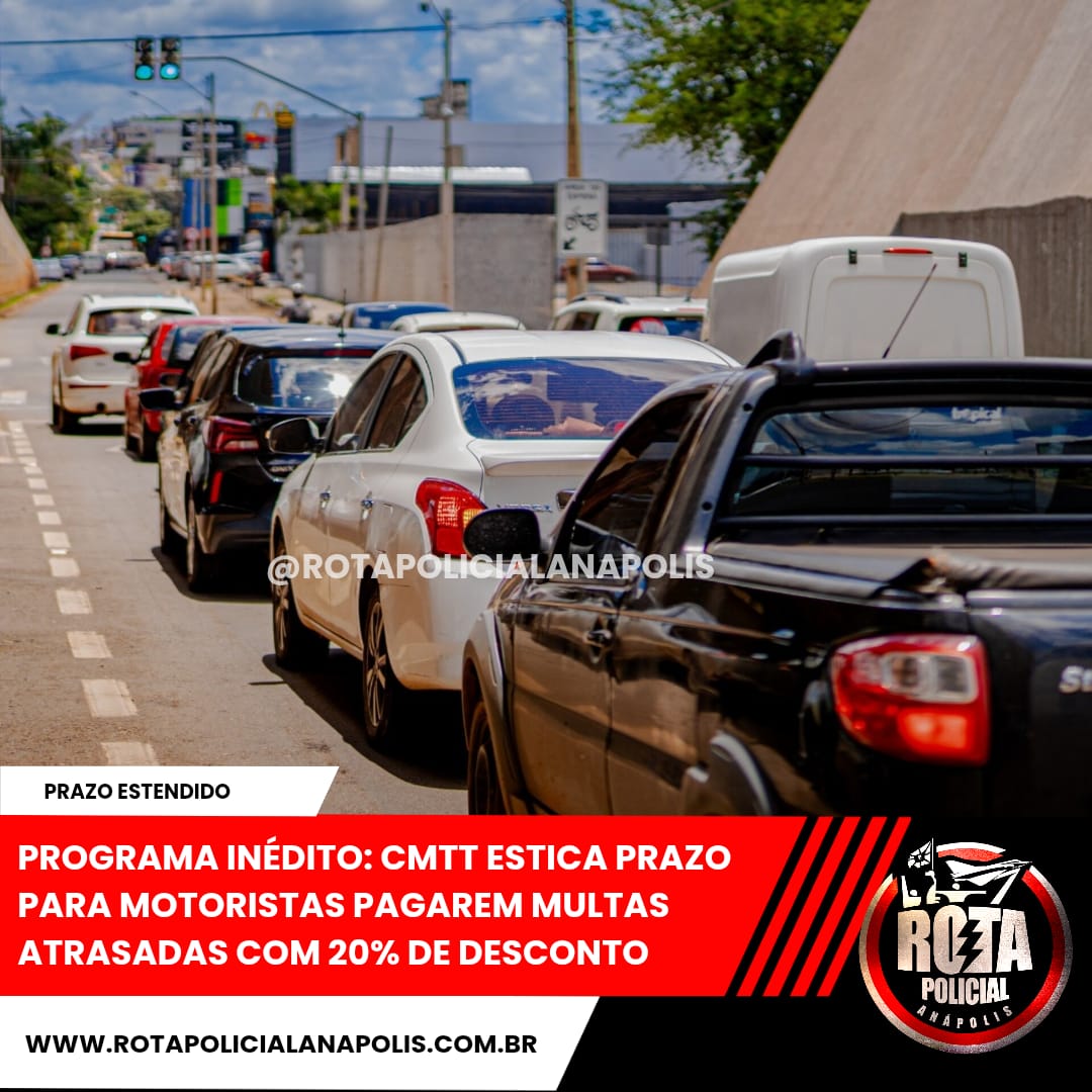 A Prefeitura de Anápolis, por meio da Companha Municipal de Trânsito e Transporte (CMTT), estendeu o prazo para que motoristas que tenham multas atrasadas registradas no município possam pagar multas atrasadas com 20%. O interessado pode protocolar o pedido na sede administrativa da CMTT, localizada na Avenida Brasil Sul, na Vila Esperança, ou por meio do e-mail protocolocmtt@anapolis.go.gov.br e do WhatsApp (62) 9 9674-2614.
