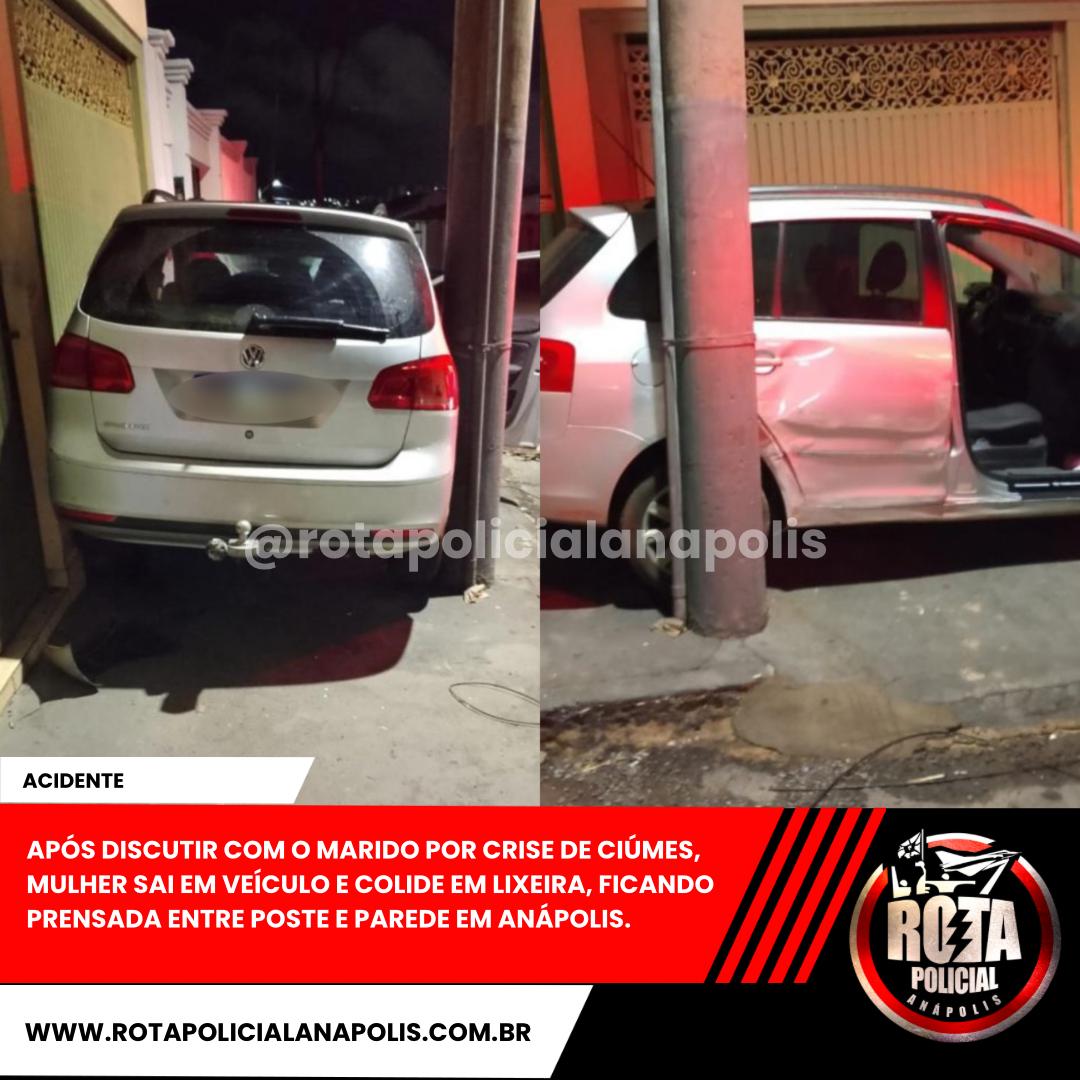 APÓS DISCUTIR COM O MARIDO POR CRISE DE CIÚMES, MULHER SAI EM VEÍCULO E COLIDE EM LIXEIRA, FICANDO PRENSADA ENTRE POSTE E PAREDE EM ANÁPOLIS.